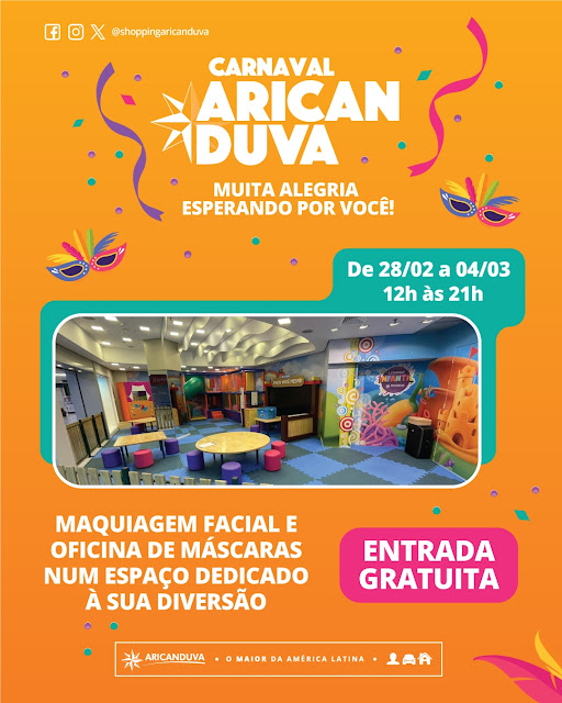 O Shopping Aricanduva, pertencente ao maior centro comercial da América Latina, será responsável pela diversão dos pequenos. No Lounge infantil, localizado na Alameda Vila Formosa, próximo à loja Di Gaspi, será o ponto de encontro perfeito para a criançada aproveitar o clima carnavalesco. Gratuito, o evento ocorre de 28 de fevereiro a 04 de março, entre 12h e 21h.